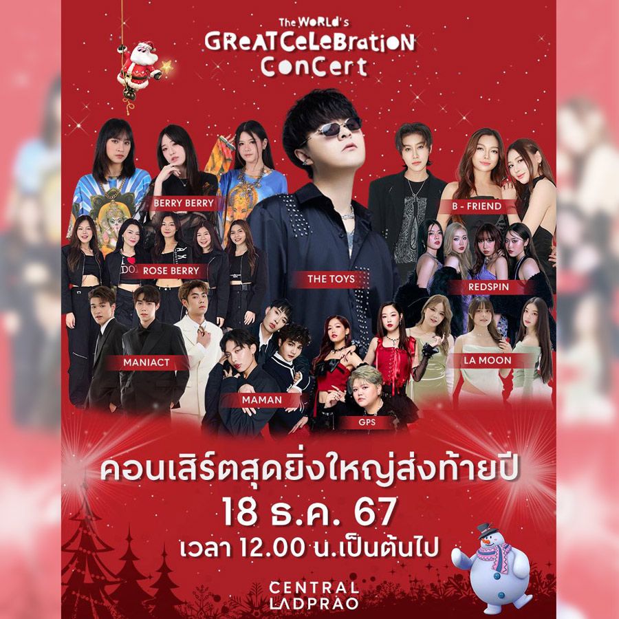 The Worlds Great Celebration Consert @Central Ladprao 18 ธันวาคมนี้! เตรียมพบกับคอนเสิร์ตสุดยิ่งใหญ่ส่งท้ายปี “The Worlds Great Celebration Consert ” พบกับ "THE TOYS" และเหล่าศิลปิน T-POP อีกมากมาย อาทิ B-FRIEND , BERRY BERRY , ROSE BERRY
